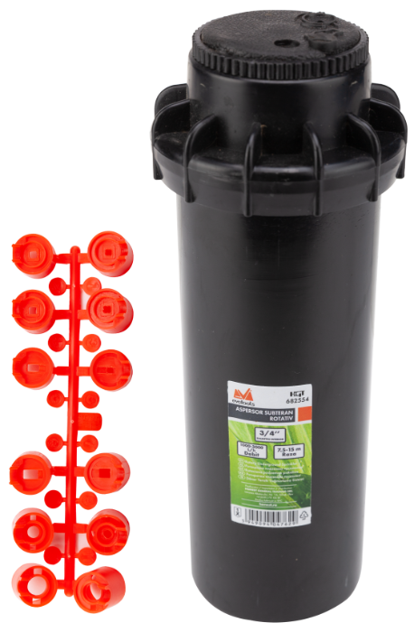 Aspersor subteran rotativ EvoTools, ideal pentru irigarea peluzelor medii și mari sau a zonelor cu arbuști. Jet turbo, duze interschimbabile și reglaj precis al razei și unghiului de udare.