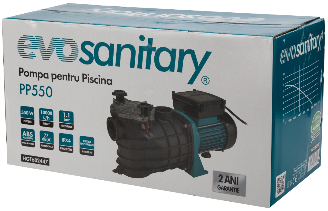 Pompa pentru piscină PP550 EvoSanitary este concepută pentru recircularea apei din piscină, dar poate fi utilizată și pentru umplerea sau golirea piscinelor de mici și medii dimensiuni. Datorită construcției robuste și materialelor de calitate, este o soluție fiabilă pentru utilizare rezidențială.