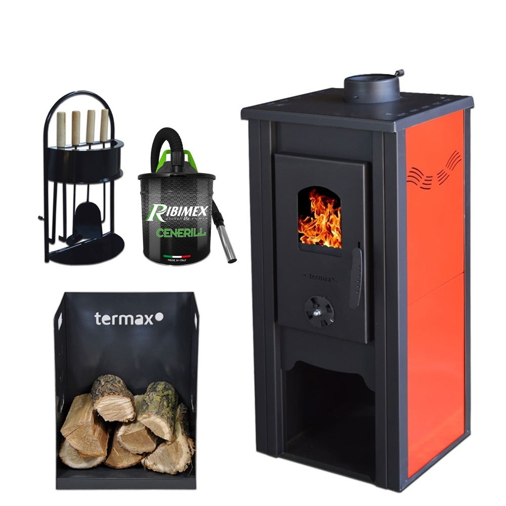 Pachet soba pe lemn Termax Bucur, 6.11 kW, randament 86.49%, 40 m², Rosu, set accesorii, aspirator cenusa si suport lemne foc metalic Termax M