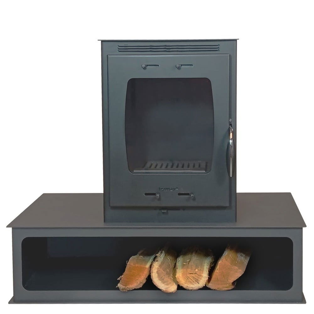 Modelul Mina se remarcă prin designul său contemporan, finisajul antracit mat și spațiul generos pentru depozitarea lemnelor, perfect pentru organizarea eficientă a zonei de foc.