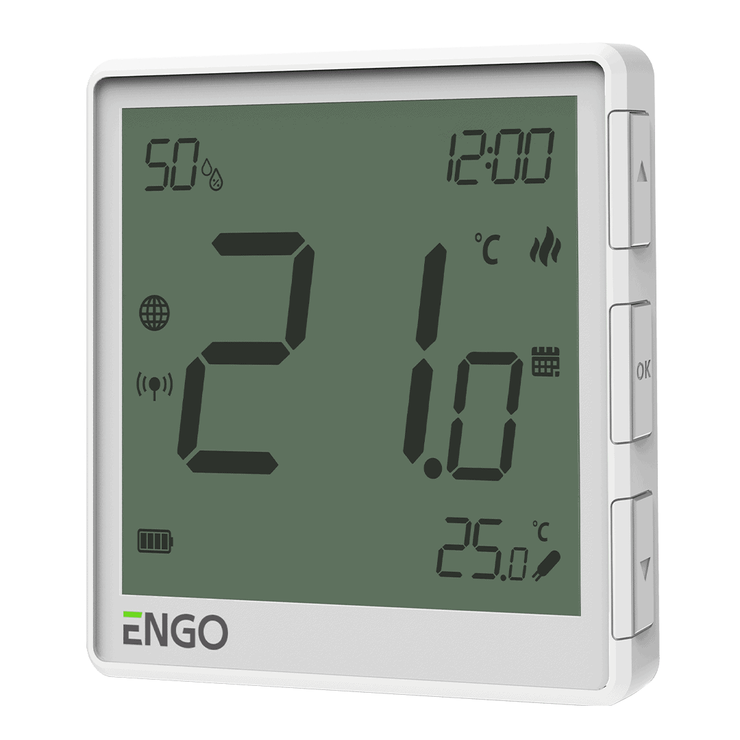 ENGO EONE-BATW este un termostat de ambient fără fir, cu alimentare pe baterie Li-Ion integrată, proiectat pentru controlul eficient al sistemelor de încălzire prin pardoseală.